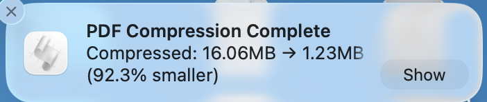 Today I made an app in Automator using Claude. It uses Ghostscript and Homebrew to compress PDF files. All you need to do is drag and drop a PDF onto it and let go. It will then show a notification displaying how much it was able to shave off. The app checks if Ghostscript/Homebrew are installed, if not it will instruct you how to install them.